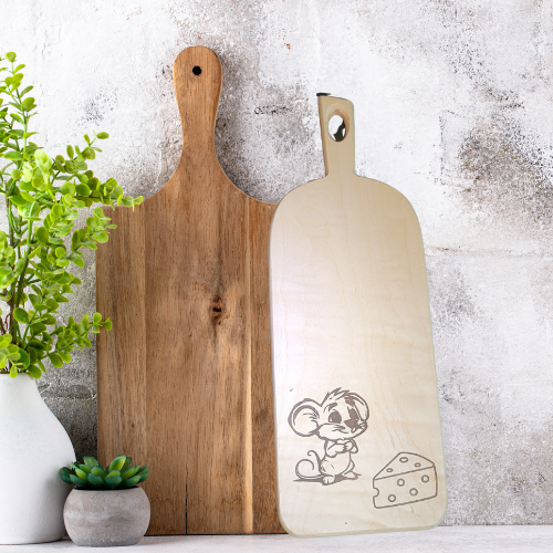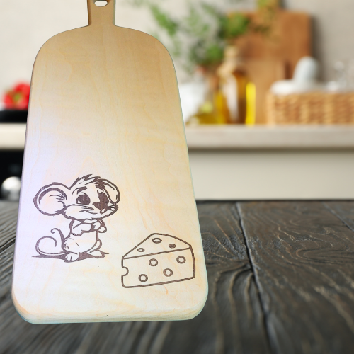 Bring a touch of whimsy to your kitchen with the Mouse & Cheese Mini Charcuterie Board, crafted from durable maple hardwood with a charming walnut inlay of a playful mouse and a chunk of cheese. Measuring 6 inches tall, 17 inches wide, and 0.75 inches thick, this compact board is perfect for serving a single portion of your favorite snacks—cheese, crackers, fruit, or charcuterie.